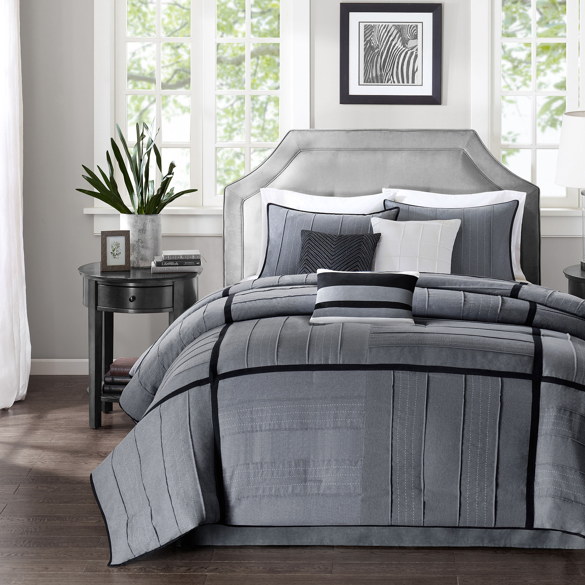 herringbone and striped pattern in gray and black luxuriously soft fabric with pintucks decorative pillows coordinate beautifully with comforter 7-piece comforter set includes: comforter 2 shams bedskirt with 15" drop 3 decorative pillows Queen set includes standard shams