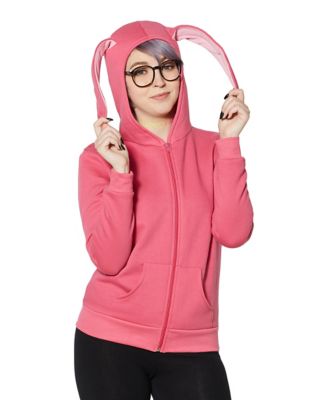 Features a zip-up front pink hoodie with bunny-eared hood and black-rim glasses